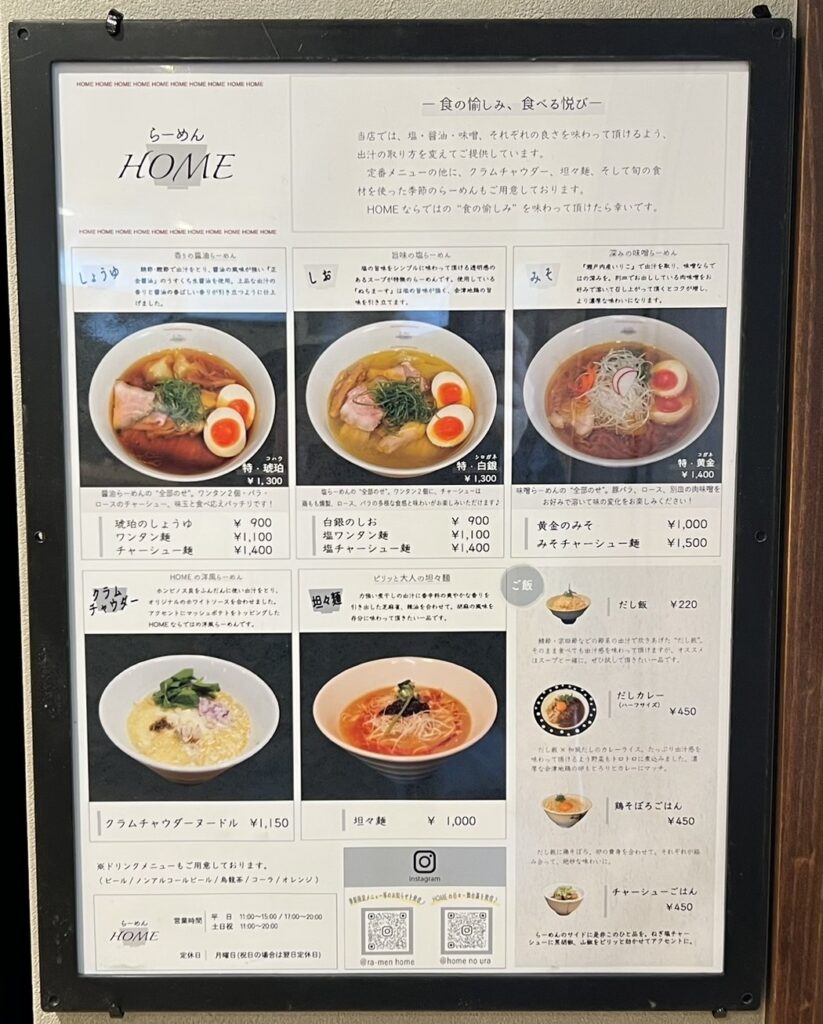 「らーめん HOME」では、しょうゆ・しお・みそ・担々麺などの定番に加え、クラムチャウダーをベースにした一杯など、バリエーション豊かなラーメンが揃っています。
