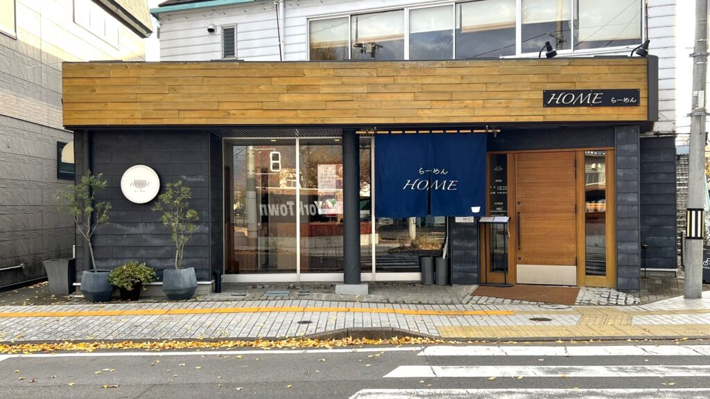 福島市入江町にある「らーめん HOME」は、ウッド調の外観に紺色の暖簾が映える、スタイリッシュな雰囲気のラーメン店。