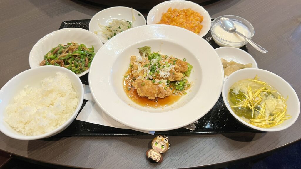 メインの油淋鶏に、エビチリや青椒肉絲、中華スープ、小鉢、デザートまで付いた、内容たっぷりのランチセットです。