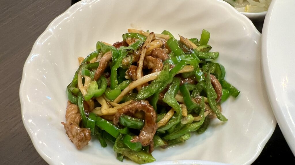 青椒肉絲は、細切りピーマンとお肉がバランスよく炒められた定番の一皿。