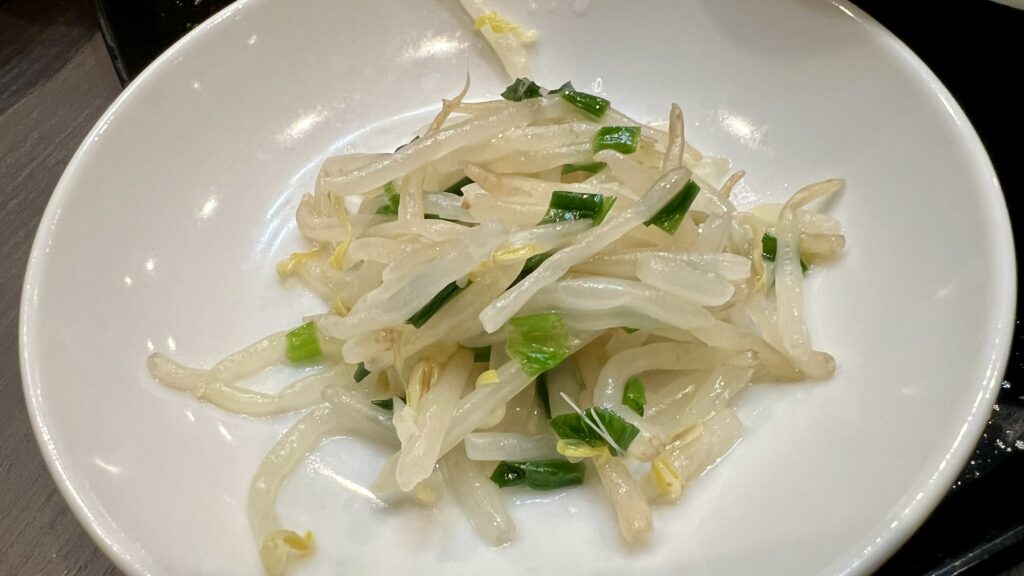 もやしの和え物はさっぱりとした味わいで、箸休めとして食事全体のバランスを整えてくれます。