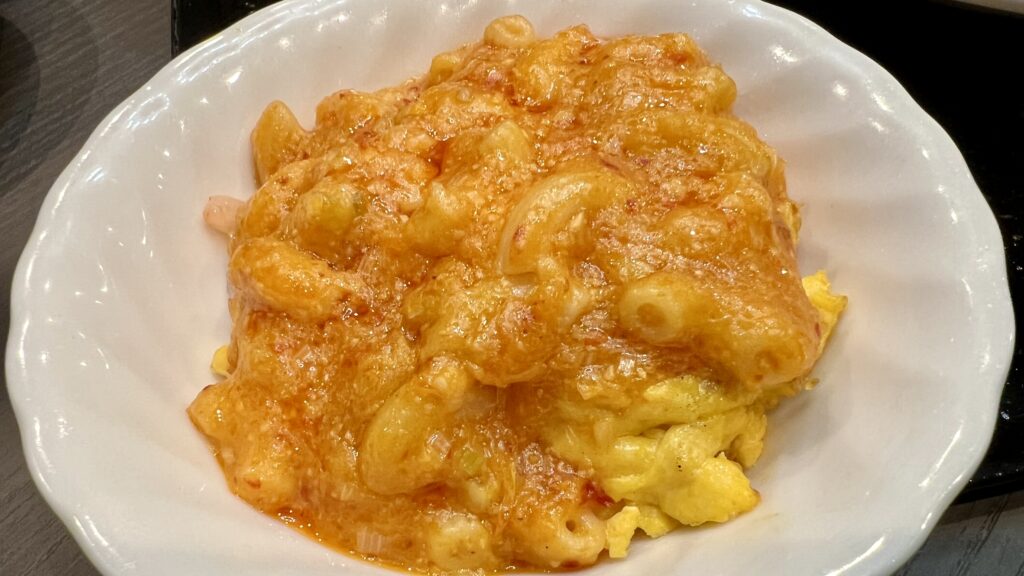 副菜のエビチリは、プリッとしたエビとマカロニにしっかり辛さのあるチリソースが絡んだ一品。