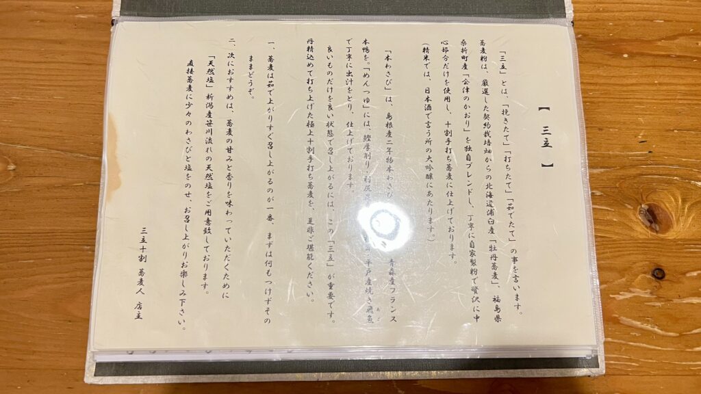また、「蕎麦の美味しい食べ方」や提供される蕎麦について丁寧にまとめられた説明資料が各席に置かれており、こだわりの蕎麦をより深く楽しめるよう配慮されています。