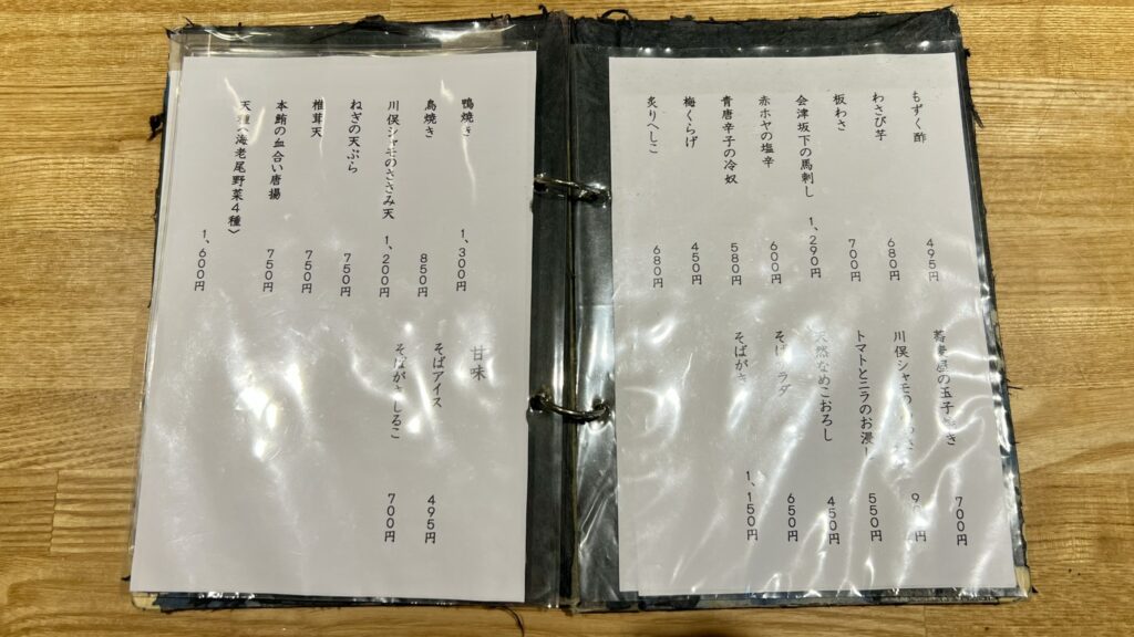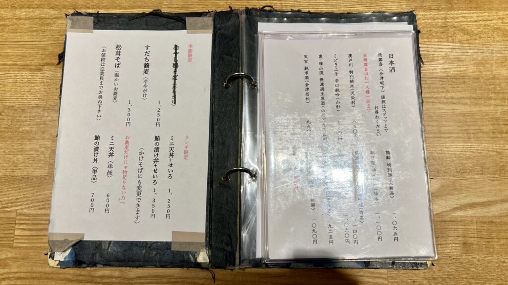 「せいろ」「かけそば」をはじめ、「鴨南蛮」「天ぷらそば」などの定番メニューが揃っています。