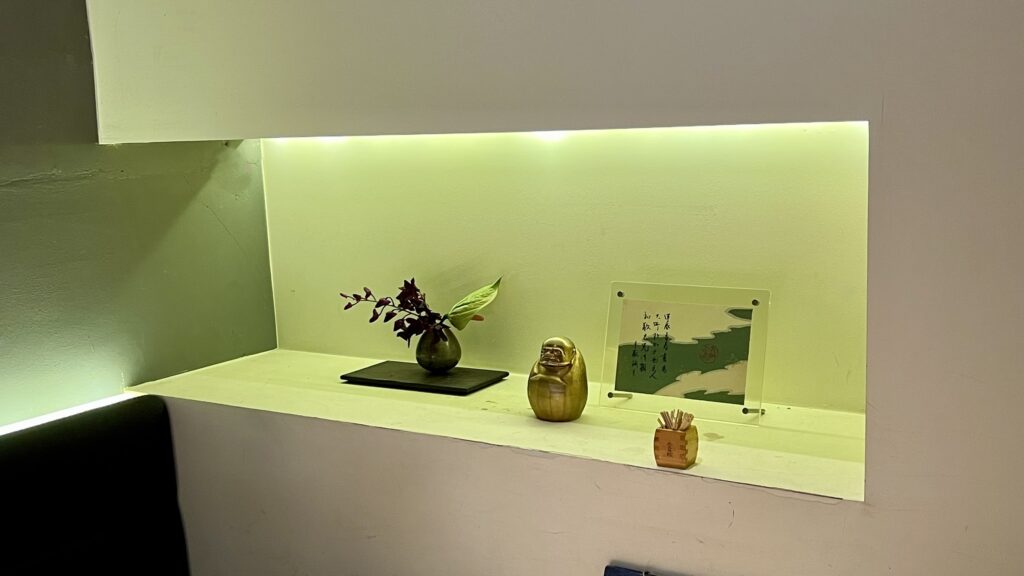 奥にはテーブル席があり、壁際の間接照明と飾られた花が上品なアクセントになっています。