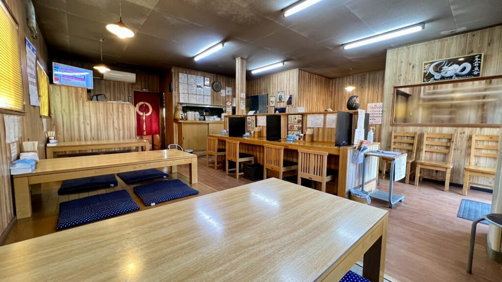 店内は木目調の壁とテーブルでまとめられた、昔ながらの食堂といった雰囲気です。