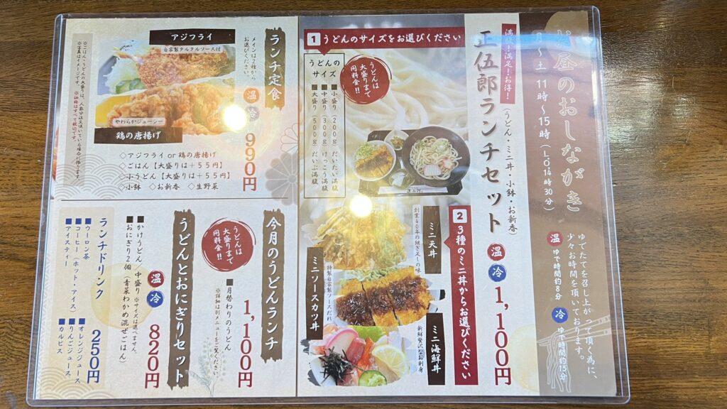 月〜土曜のランチタイムにはうどんとミニ丼・小鉢がセットになったお得な「正伍郎ランチセット」も用意されています。