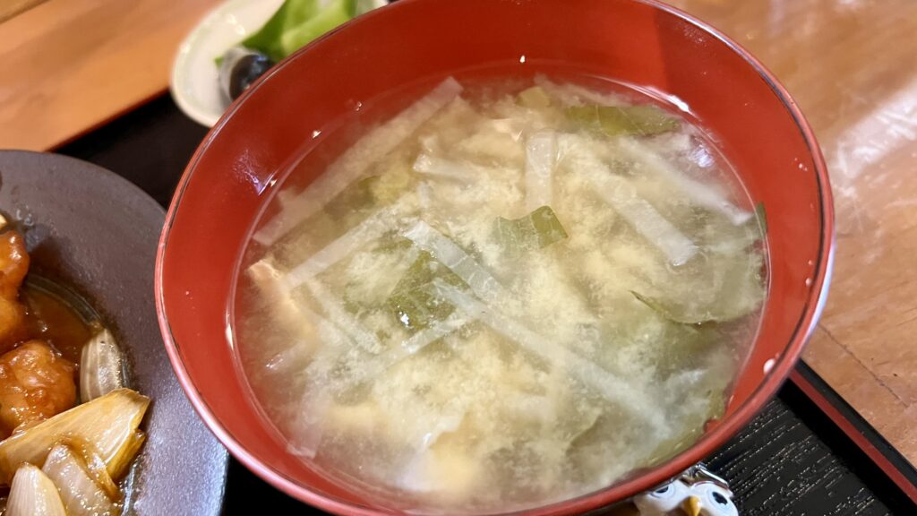 味噌汁には大根と豆腐が入り、出汁の香りがふわりと立ち上る優しい味わい。