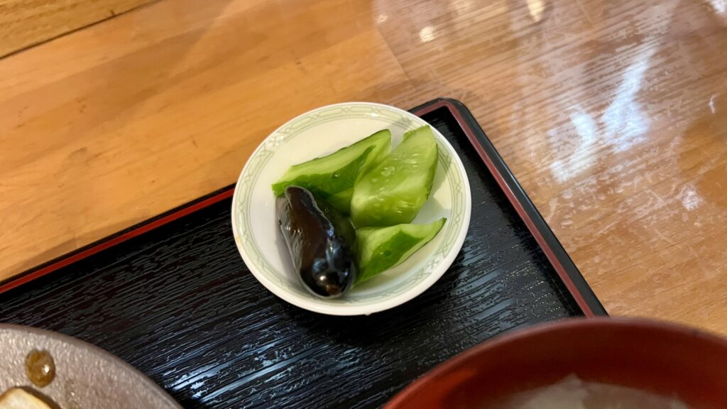 茄子ときゅうりの香の物は、さっぱりとした味で全体を引き締めます。