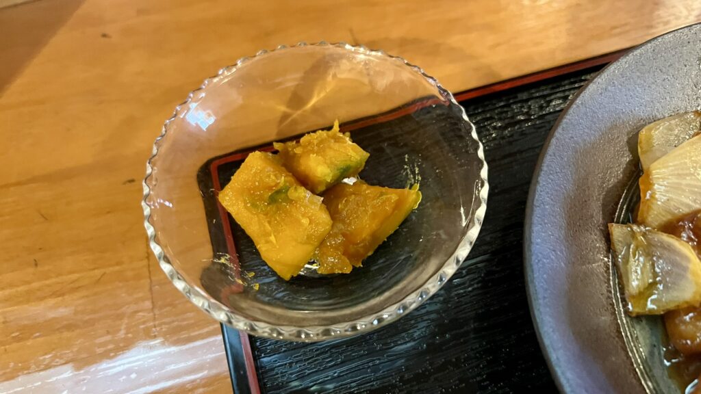 小鉢のかぼちゃの煮物は甘みがしっかりと感じられ、箸休めにぴったり。